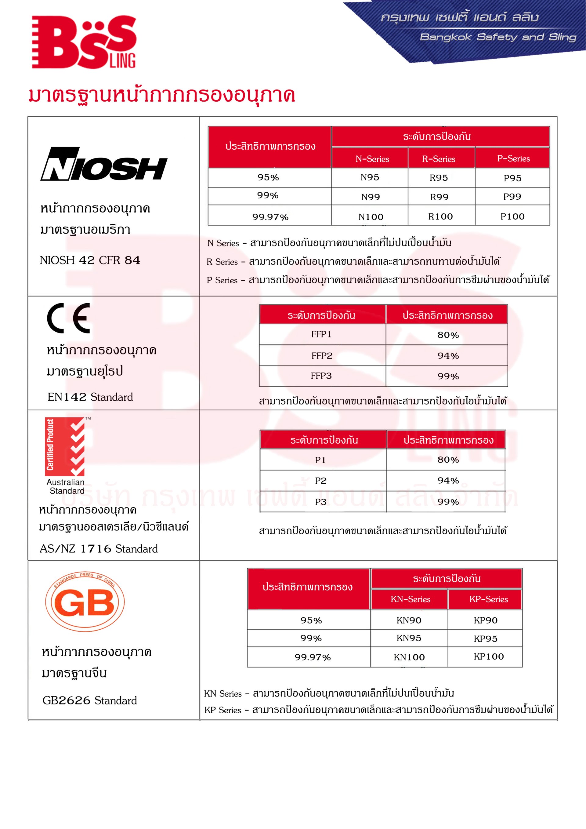 มาตรฐานหน้ากากกรองอนุภาคจะมีอยู่หลายมาตรฐานด้วยกัน ซึ่งที่คนไทยรู้จักกันมากที่สุดจะเป็นหน้ากาก N95 จะเป็นมาตรฐานของอเมริกา โดยที่ยังมีอีกหลายมาตรฐานที่ได้รับการยอมรับในทางสากล ซึ่งมีประสิทธิภาพการกรองเทียบเท่ากันกับมาตรฐานอเมริกา ซึ่งสามารถดูประสิทธิภาพการกรองต่างๆได้ตามตารางด้านล่าง