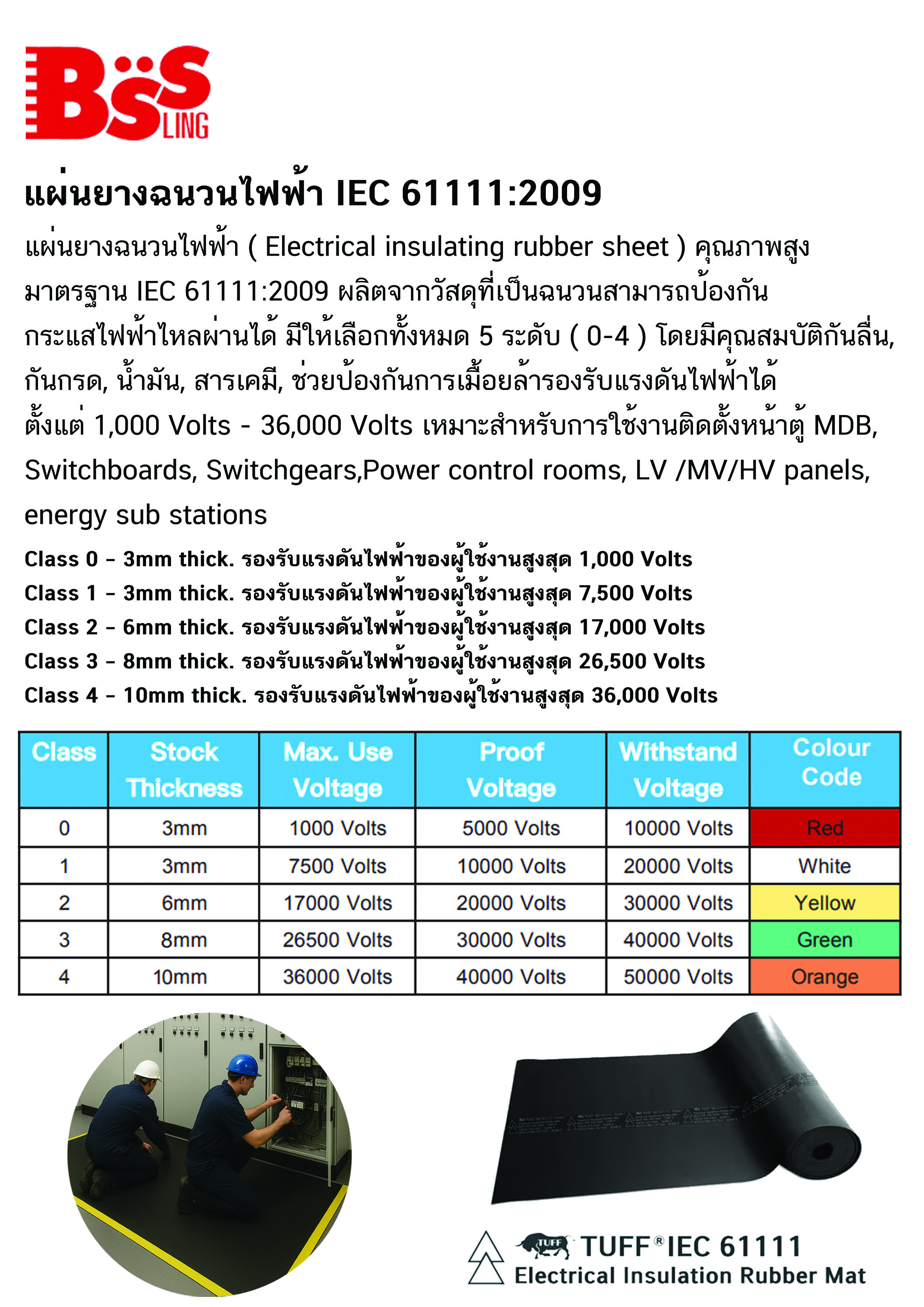 แผ่นยางฉนวนไฟฟ้า ( Electrical insulating rubber sheet ) คุณภาพสูง มาตรฐาน IEC 61111:2009 ผลิตจากวัสดุที่เป็นฉนวนสามารถป้องกันกระแสไฟฟ้าไหลผ่านได้ มีให้เลือกทั้งหมด 5 ระดับ ( 0-4 ) โดยมีคุณสมบัติกันลื่น, กันกรด, น้ำมัน, สารเคมี, ช่วยป้องกันการเมื้อยล้า รองรับแรงดัันไฟฟ้าได้ตั้งแต่ 1,000 Volts - 36,000 Volts  เหมาะสำหรับการใช้งานติดตั้งหน้าตู้ MDB, Switchboards, Switchgears, Power control rooms, LV /MV/HV panels, energy sub stations